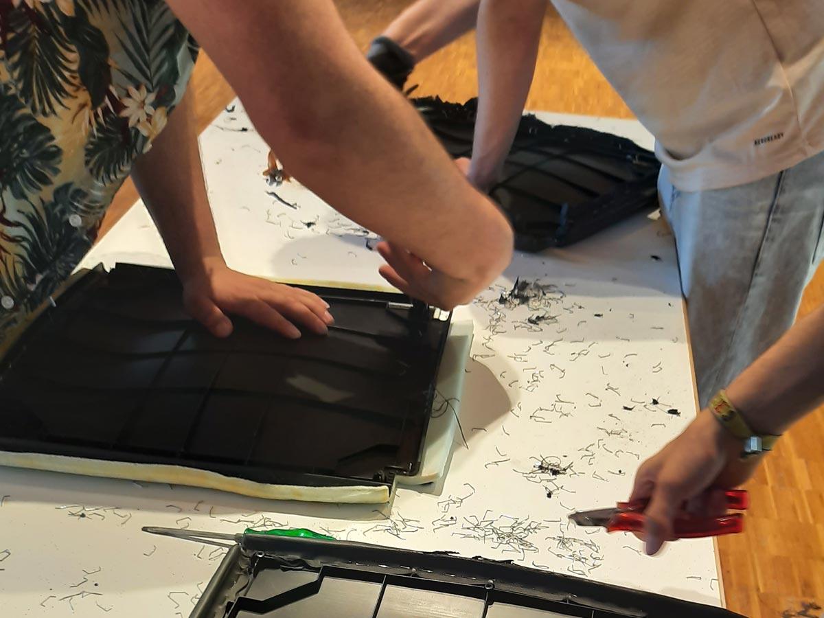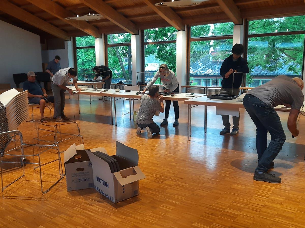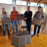 Beim nächsten Helfertreffen wurden dann zuerst die neuen Sitzpolster auf die Stuhlrahmen montiert. Anschließend wurden weitere Stühle zerlegt, was durch die bereits vorhandene Übung schneller als beim ersten Termin von statten ging. Am Ende des Tages waren alle übrigen Stühle zerlegt und noch einmal gingen knapp 100 Sitzflächen zu Erich Schneider.