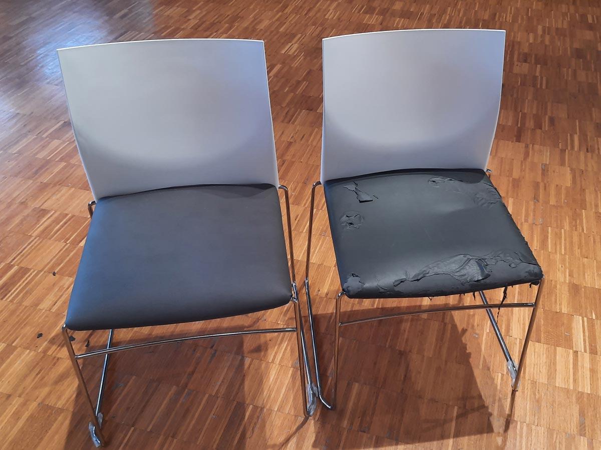 Im Jahr 2014 wurde die Bestuhlung des Pfarrsaals im Pfarrzentrum Maria am Wege erneuert. Man entschied sich damals für einen optisch „schlanken“ Stuhl mit einem Metallrahmen, einer weißen Rückenlehne und einem dunkelgrauen Sitzpolster. Insgesamt wurden 180 Stühle beschafft, um auch für größere Veranstaltungen gewappnet zu sein. Lange Zeit haben diese Stühle gute Dienste geleistet, bevor sich vor ca. zwei Jahren bei allen Stühlen nach und nach die oberste Schicht des Bezugs abzulösen begann. Nach jeder Veranstaltung lagen größere und kleinere dunkle Fetzen auf dem Boden des Pfarrsaals verteilt und schnell war klar, dass der Bezug der Sitzpolster erneuert werden musste.